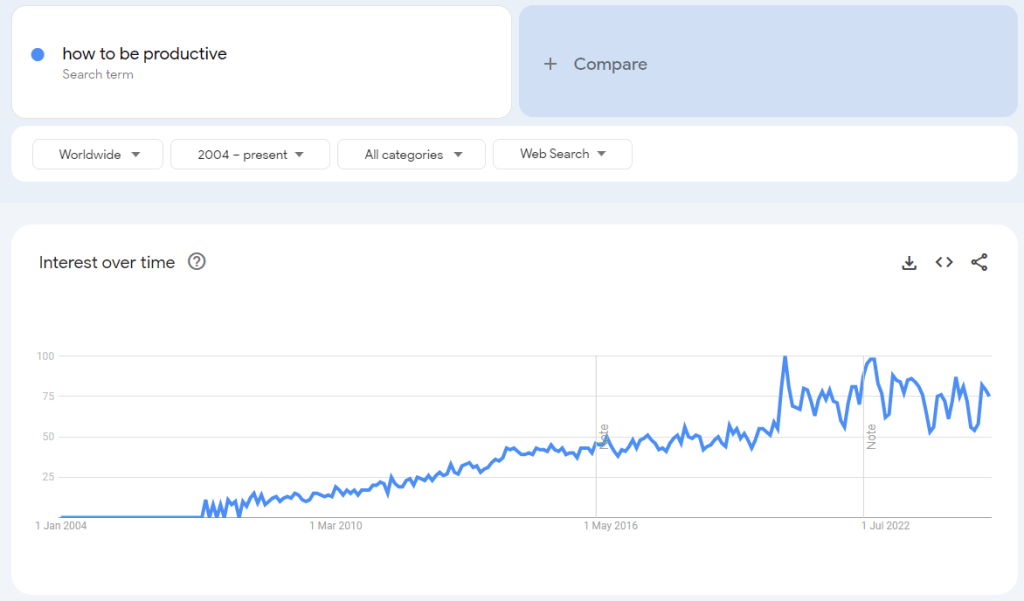 Despite the ever-growing arsenal of tools, self-help books, LinkedIn posts, and Instagram influencers, productivity remains as elusive as the ‘outstanding’ rating during appraisals. If you check the web search trends for ‘how to be productive’ for the last decade, it’s a chart that could rival Nvidia’s stock price.